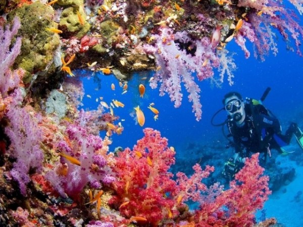 В воде можно увидеть около 250 видов кораллов, разных цветов и причудливых форм. Для этого вам придётся надеть акваланг и совершить погружение, но поверьте, оно того стоит.